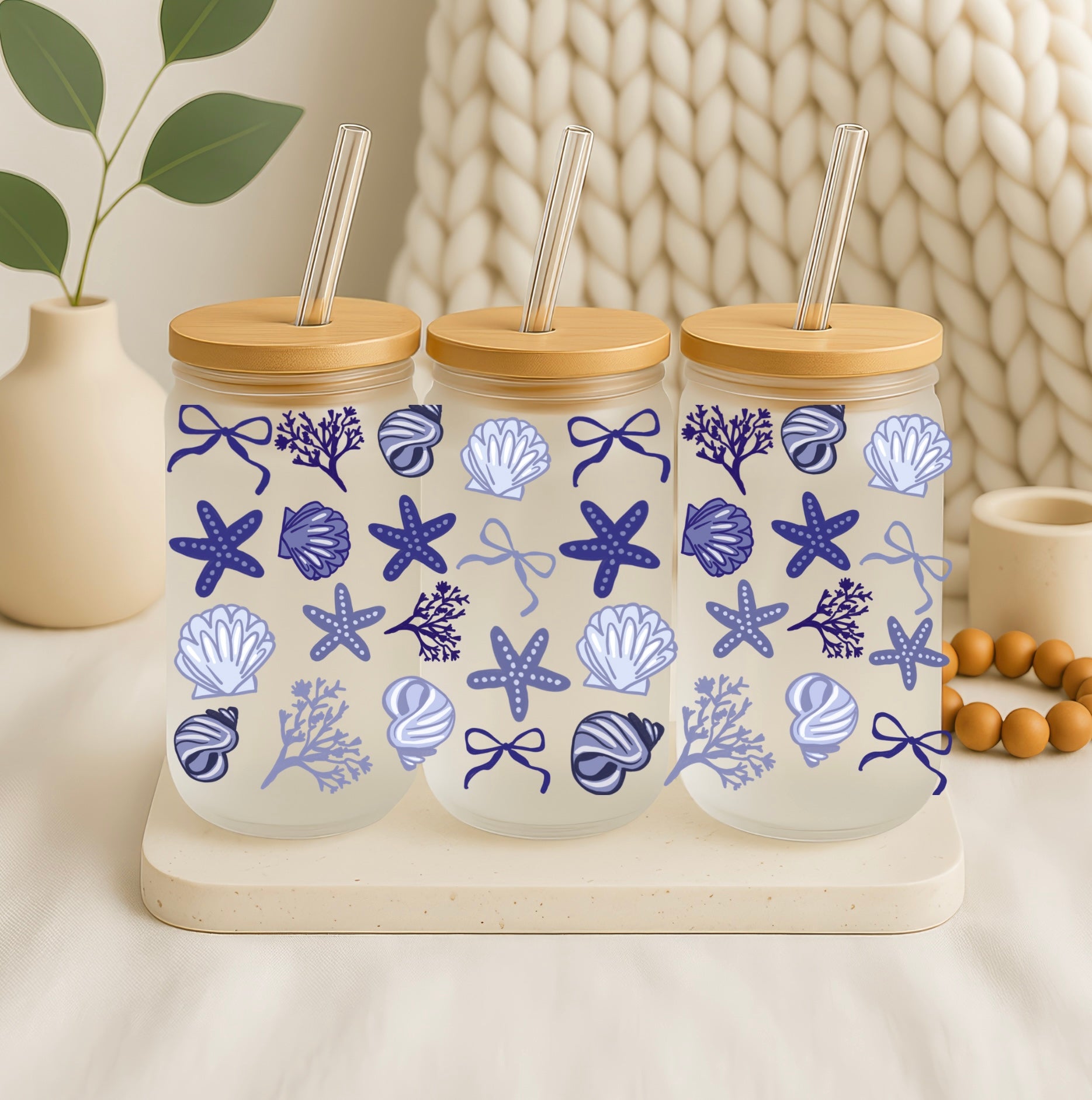 Deze elegante matte glazen beker van 16oz is versierd met een prachtig zee-thema in zachte blauwtinten. De illustraties van zeesterren, schelpen, strikjes en koraal brengen een zomerse en rustgevende sfeer. De beker is voorzien van een bamboe deksel en een herbruikbaar glazen rietje, ideaal voor ijskoffie, smoothies of verfrissende drankjes. Een stijlvolle én duurzame keuze voor dagelijks gebruik.