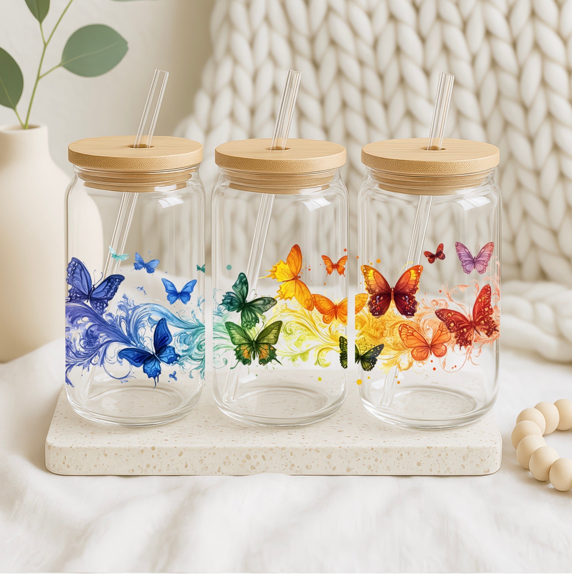 Breng kleur en vrolijkheid in je dagelijkse routine met deze prachtige glazen beker met bamboe deksel en rietje, versierd met sierlijke regenboogvlinders.