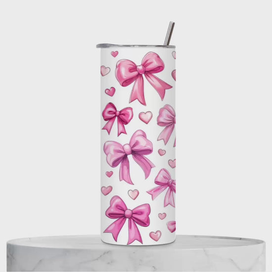 Voeg een schattige en stijlvolle touch toe aan je dagelijkse drankjes 💗 Deze gepersonaliseerde skinny tumbler heeft een lief roze strikjes- en hartjesdesign met jouw naam verticaal bedrukt. Perfect voor koffie, ijskoude drankjes of als cadeau. Herbruikbaar, trendy en speciaal op maat gemaakt – ideaal voor verjaardagen, vriendinnen of gewoon voor jezelf ✨